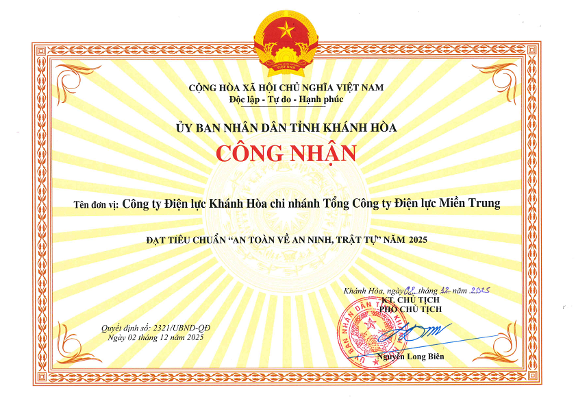 CÔNG TY ĐIỆN LỰC KHÁNH HÒA ĐẠT TIÊU CHUẨN “AN TOÀN VỀ AN NINH, TRẬT TỰ”